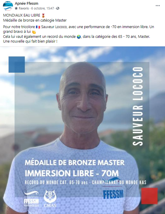 Deux mois d’entraînement intensif à Kalamata (Grèce) avec Stavros Kastrinakis et son équipe du Freediving Club Greece, et Sauveur a renouvelé ses exploits : 70 m en Immersion Libre et 60 m en poids constant bi-palmes lors du Championnat du Monde Masters CMAS qui avait lieu les 6 et 9 octobre  à Kas en Turquie.